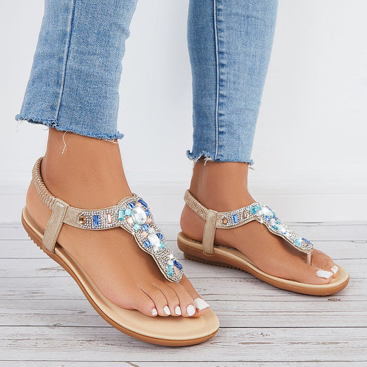 Rhinestone Flat Beach Shoes Boho Beaded Flip Flops Sandals