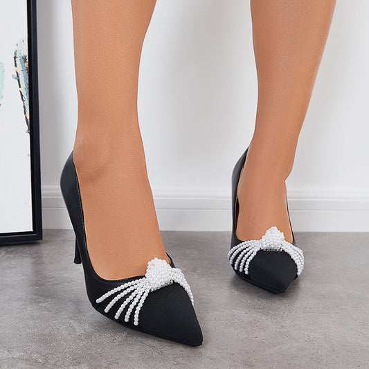 Pearls Knot High Heel Pumps Pointed Toe Stilettos Dress Shoes