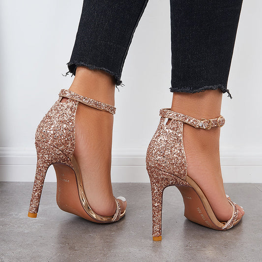 Rhienstone Stilettos Shiny Open Toe High Heel Ankle Strap Pump Sandals