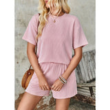 Women's Short-Sleeved Wavy Crew Neck Top Elastic Waist Shorts Two-piece Sets